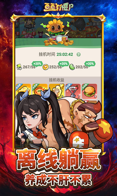(本游戏适合12岁以上用户)休闲放置卡牌游戏《豆豆打僵尸》火爆开启!游戏结合了休闲放置与卡牌策略,你不仅可以自动战斗,解放双手,也可以集结风格各异的伙伴,挂机自动养成,组成独一无二的阵容为你而战!Q萌画风搭配幽默设定,还有养僵尸、密室求生等趣味玩法,带给你前所未有的解压体验!